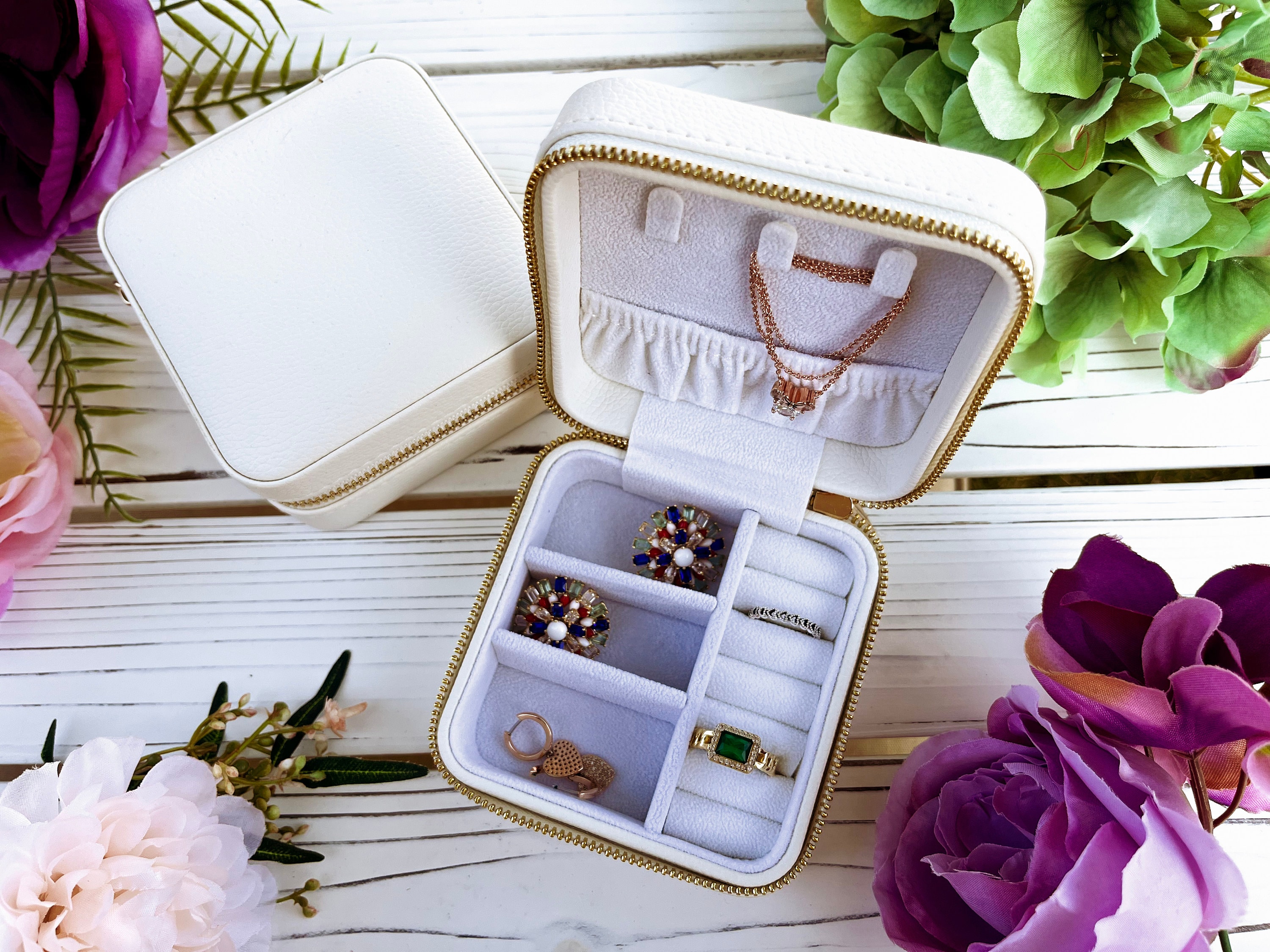 Kathy creations Jewelry box organizer travel accessories perfectly combine functionality with style, keeping your jewelry collection protected and neatly organized no matter where the day takes you! Featuring various multipurpose slots that easily accommodate rings, necklaces or earrings, with a superb velvet exterior and your name or initials carefully engraved, these jewelry boxes for women will come in handy for business travels, vacation, or at home!