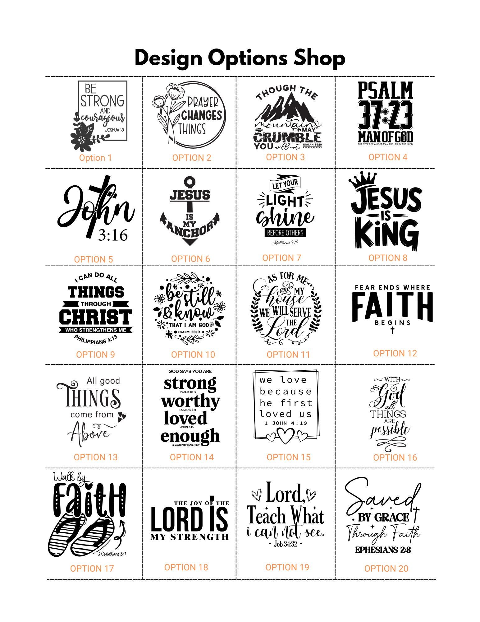 Available Colors: 🌸 Pink – John 3:16 🌹 Rose Gold – Jesus -The way, the true, the life. 💙 Blue – Saved by Grace (Ephesians 2:8) 🌿 Mint – Not Perfect, Just Forgiven 💜 Lavender – Trust in the Lord (Proverbs 3:5) 🤍 White – Though the Mountains May Crumble (Isaiah 54:10)