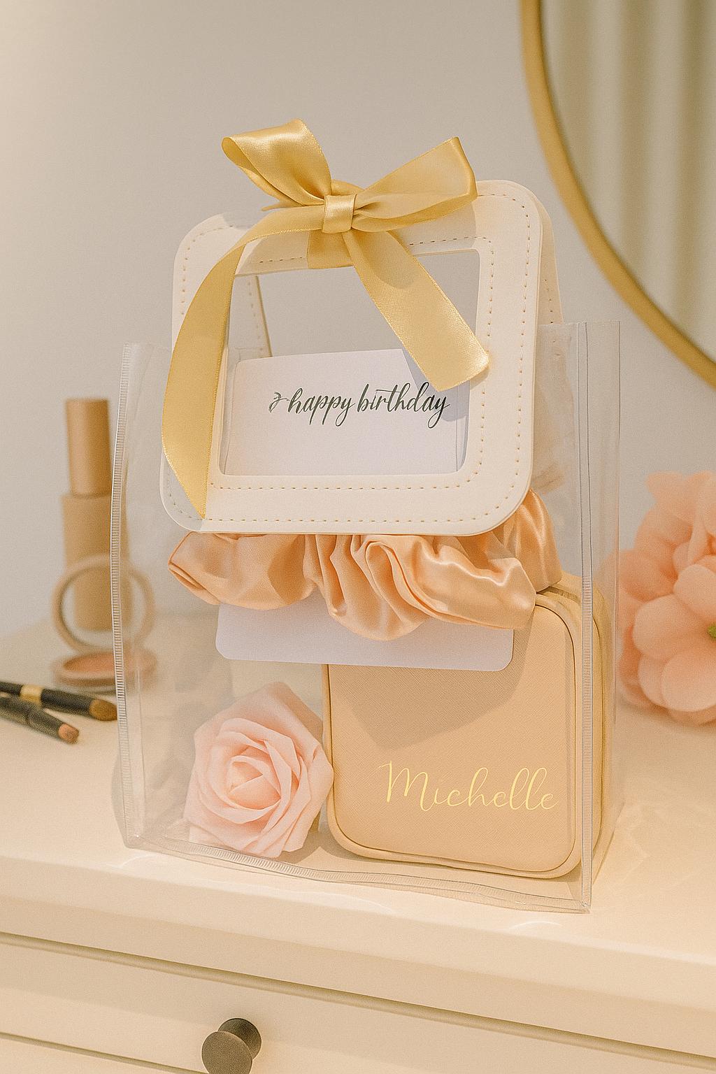 Gift Bag with Ribbon Handle – A stylish and reusable clear bag with gold satin bow, making gifting effortless.